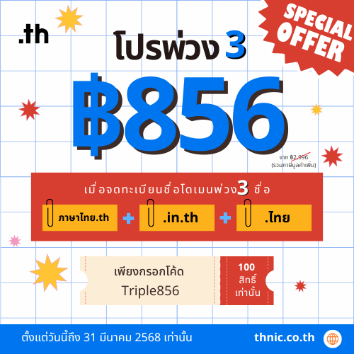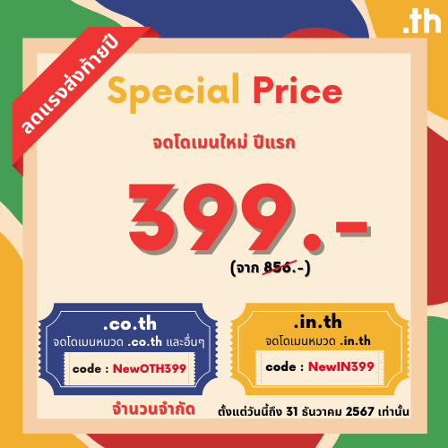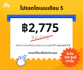 1 เมษายน 2568 “เริ่มต้นธุรกิจปัง รับปีใหม่ไทย”เพียงจดทะเบียนโดเมนใหม่ .co.th หรือ .in.th ไม่จำกัดจำนวนปี ลุ้นรับรางวัลในวันมงคลเดือนเมษายนนี้ |
