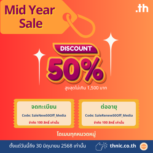![]() | 13 มิถุนายน 2568 Mid Year Sale ลด 50%จดทะเบียนโดเมนใหม่หรือต่ออายุโดเมนเดิม ลด 50% ทุกหมวดหมู่ |