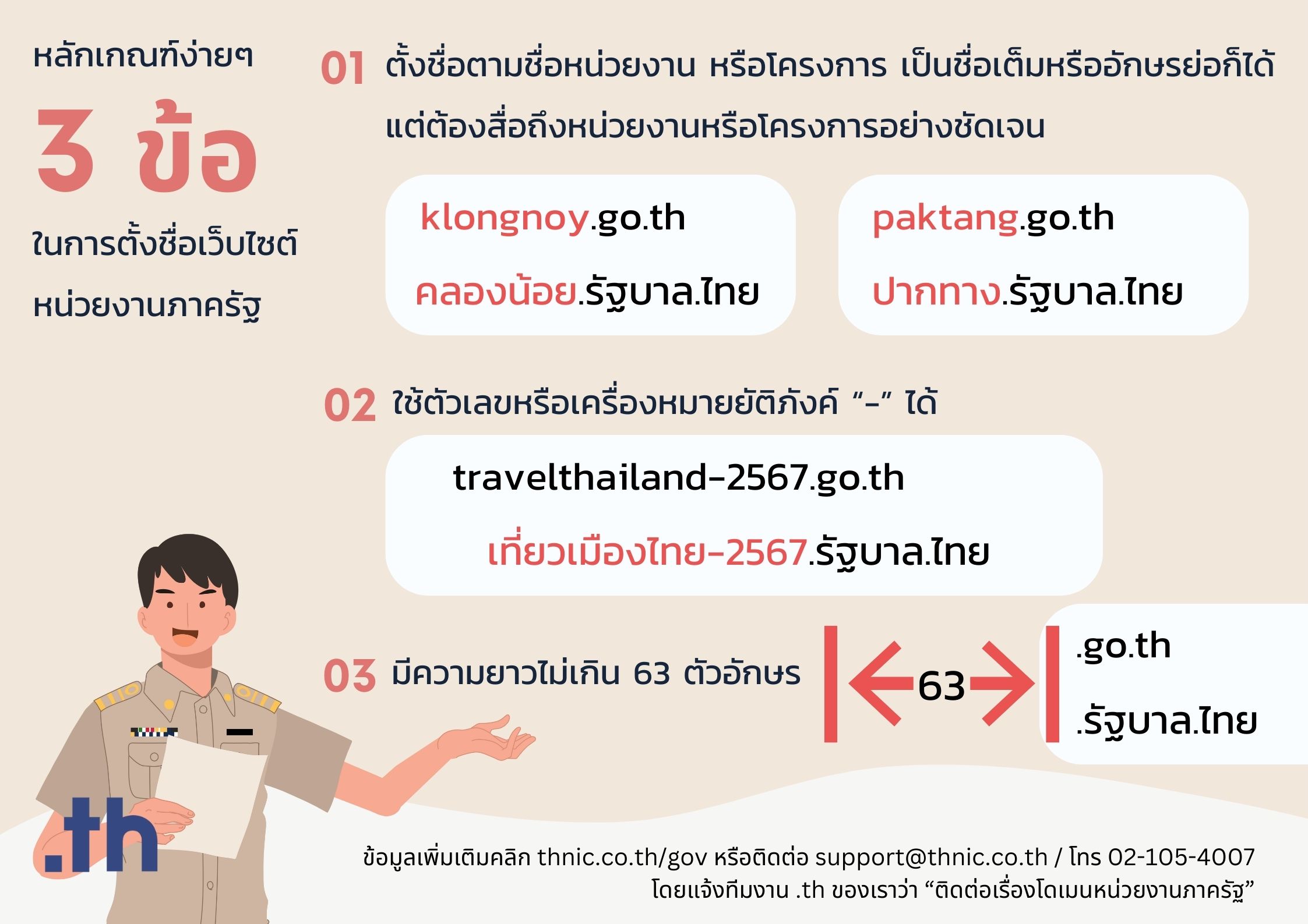 1. ตั้งชื่อตามชื่อเต็ม หรือชื่อย่อของหน่วยงาน โครงการ กิจกรรม หรือ บริการ โดยที่ต้องสื่อถึงหน่วยงาน โครงการ กิจกรรมหรือบริการอย่างชัดเจน และสามารถจดชื่อภาษาอังกฤษ 1 ชื่อ แถมชื่อภาษาไทยพ่วง 1 ชื่อ